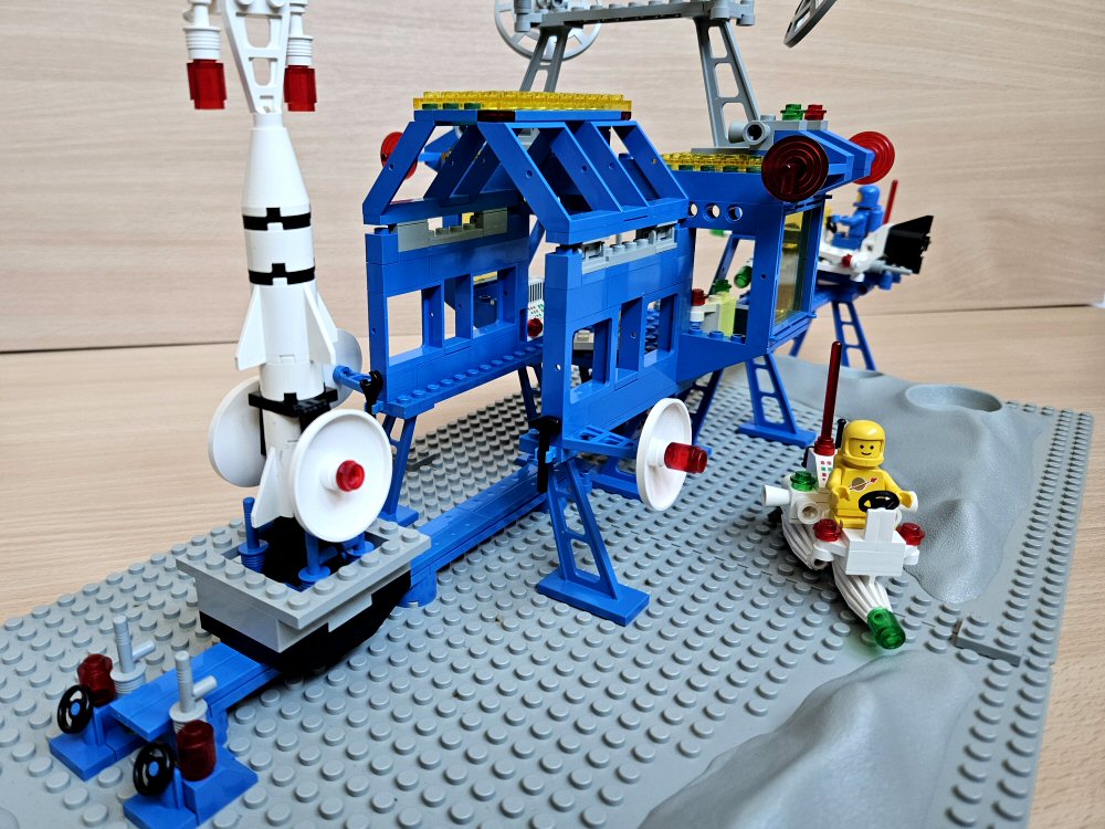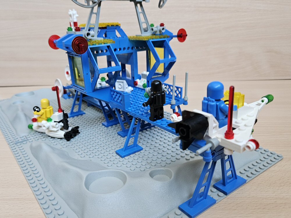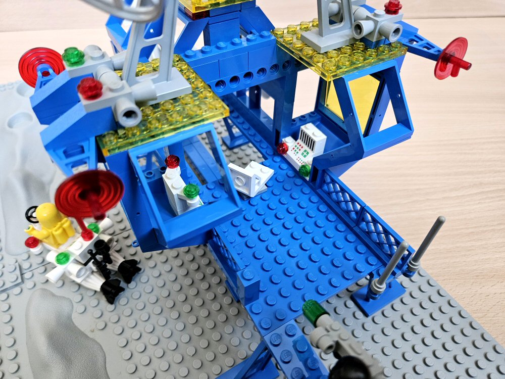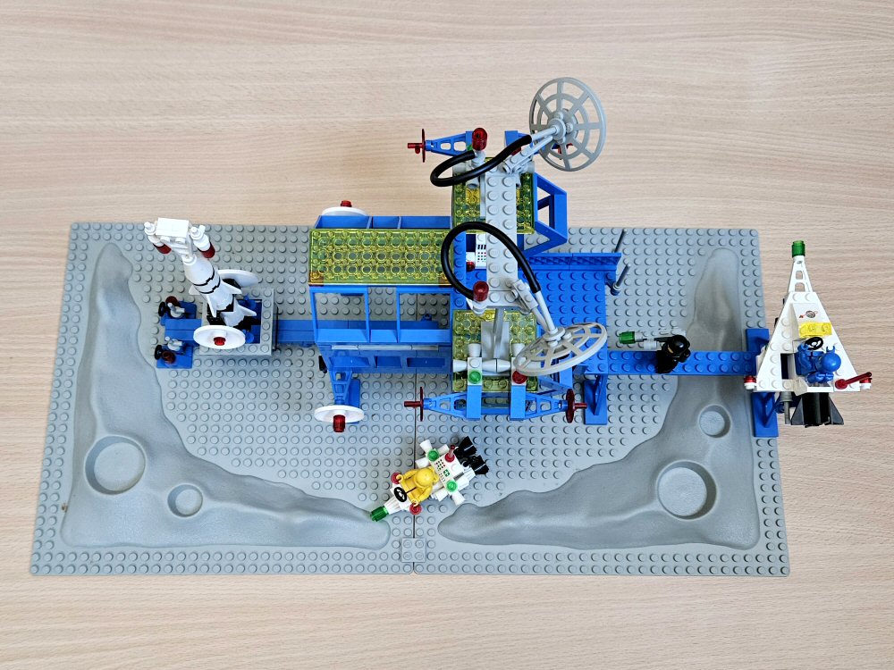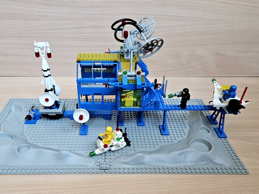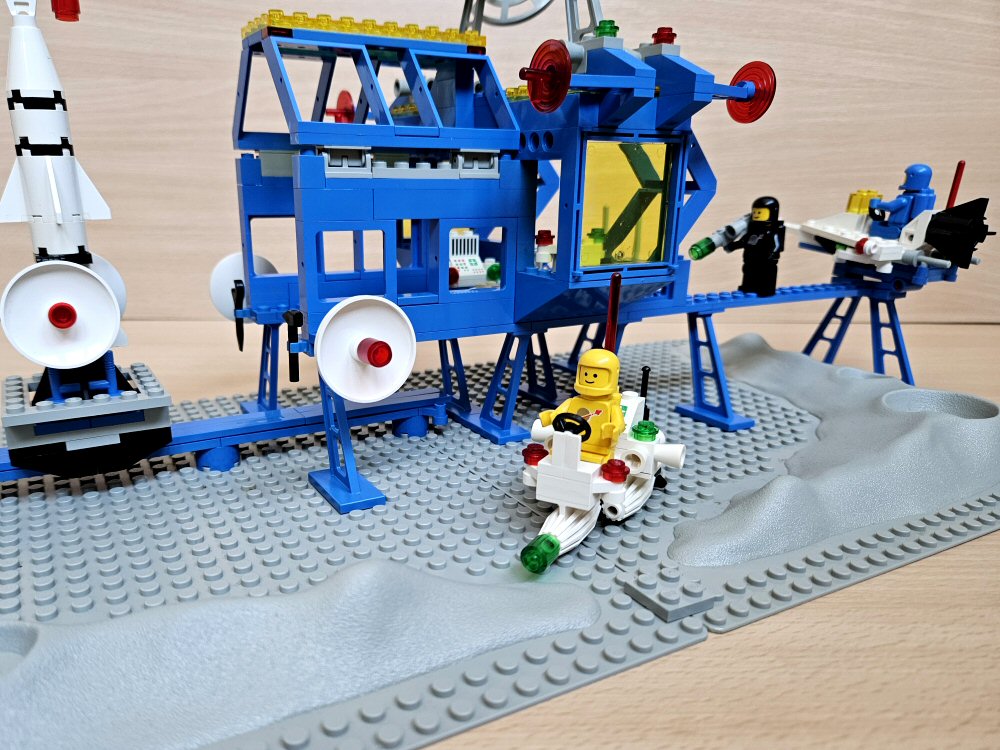 Installée sur 2 plaques "cratères", cette base se monte relativement rapidement, avec ses 328 pièces. Une fois que tout est bien en place, elle permet de faire pas mal de choses : il y a un centre principal de contrôle avec de grandes fenêtres et 2 grands radars sur le toit, un pas de tir pour lancer une petite fusée d'un côté, une petite zone d'envol pour une navette de l'autre et un petit véhicule terrestre en complément. 3 minifigs sont présentes dans ce set, dont une bleue et une noire qui sont des nouvelles couleurs depuis cette année. Avec ça, n'importe quel gamin à l'époque pouvait déjà imaginer de belles aventures au sein même de cette base ou autour, tel un explorateur.