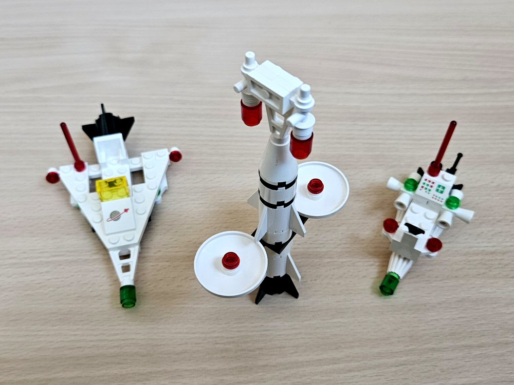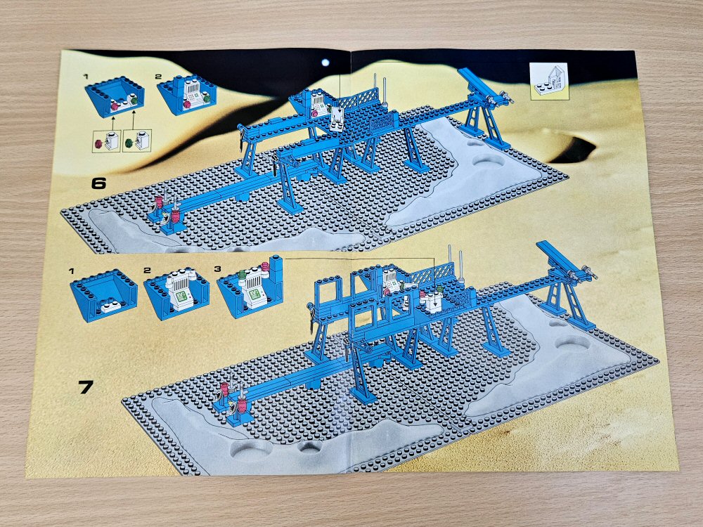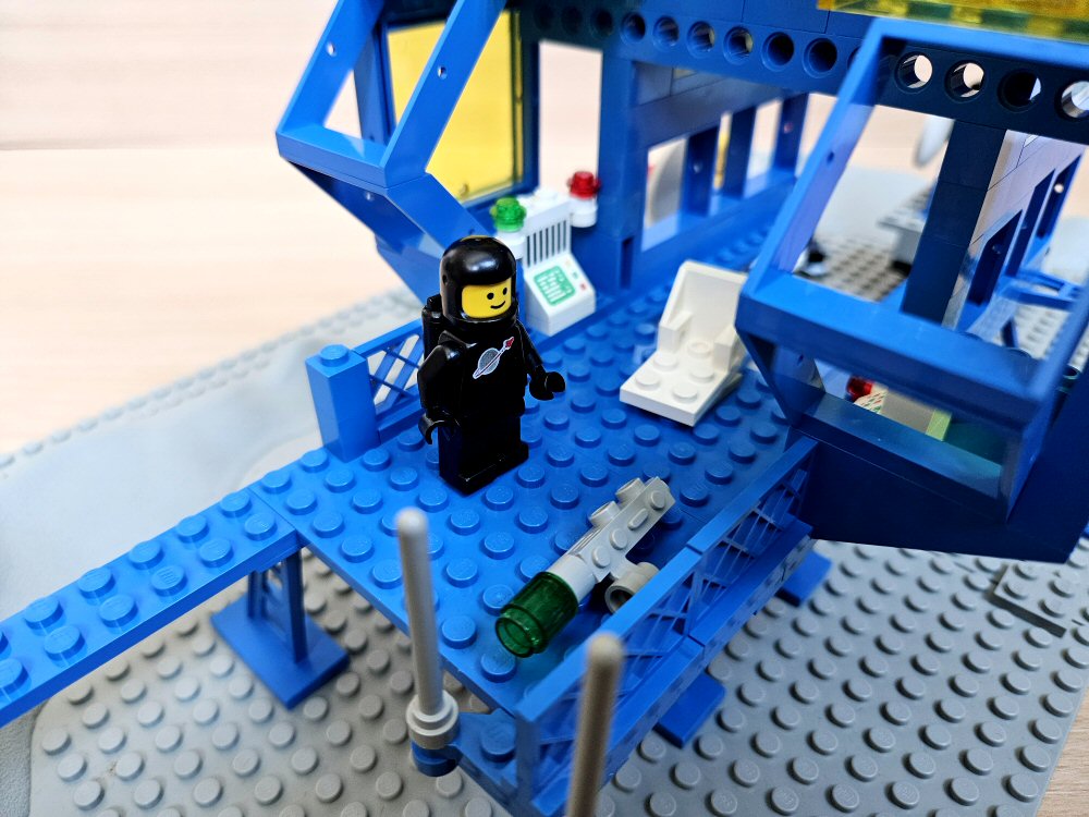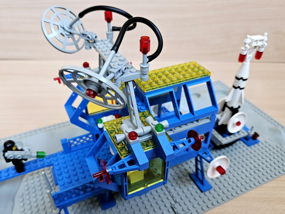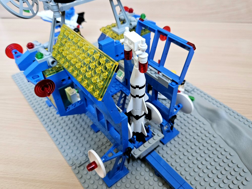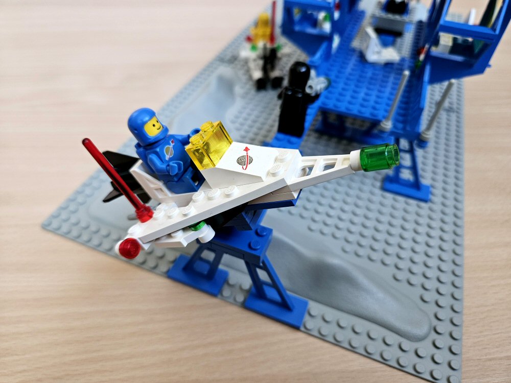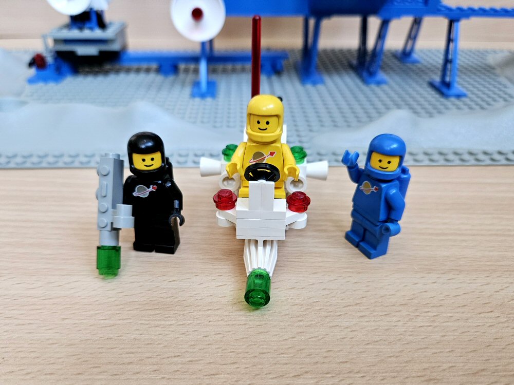 Installée sur 2 plaques "cratères", cette base se monte relativement rapidement, avec ses 328 pièces. Une fois que tout est bien en place, elle permet de faire pas mal de choses : il y a un centre principal de contrôle avec de grandes fenêtres et 2 grands radars sur le toit, un pas de tir pour lancer une petite fusée d'un côté, une petite zone d'envol pour une navette de l'autre et un petit véhicule terrestre en complément. 3 minifigs sont présentes dans ce set, dont une bleue et une noire qui sont des nouvelles couleurs depuis cette année. Avec ça, n'importe quel gamin à l'époque pouvait déjà imaginer de belles aventures au sein même de cette base ou autour, tel un explorateur.
