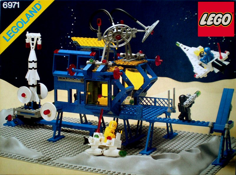 1984 est un peu une vague "bleue" dans toute cette gamme classique. 8 modèles sortent, avec 2 gros très notables : un robot déjà, le Robot Command Center (n°6951, 295 pièces) et une nouvelle grosse base, la Inter-Galactic Command Base (n°6971, 328 pièces). Et une petite nouveauté que l'on ne remarque pas forcément immédiatement, c'est aussi l'apparition de mini-figurines bleues et noires pour des spationautes, dans cette nouvelle base justement, ainsi que quelques autres modèles. En effet, on avait eu jusqu'à présent que des mini-figurines blanches, jaunes ou rouges.